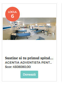 În prezent, ADRA România se poziționează pe locul 6, iar pentru a fi câștigători este necesar să se poziționeze în primele 3 locuri ale clasamentului. Împreună vom reuși. Mai sunt 3 zile în care poți dona pentru a susține achiziționarea unei ambulanțe pentru spitalul ADRA din Irak. Donează acum pentru ambulanța ADRA accesând următorul link: